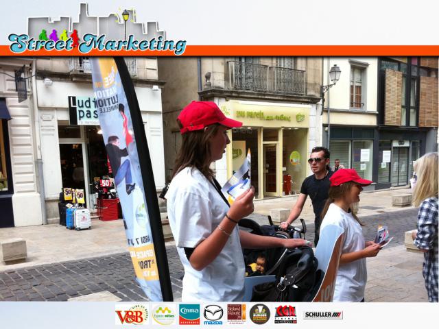 Street Marketing à BesançonDistribution de prospectus ou Flyers à Besançon Le Street Marketing Créez l’évènement avec STREET PUB Des prestations énergiques Des hôtes/hôtesses qui parlent de votre produit à une population ciblée. Une forte mémorisation Chaque jour nos hôtesses distribueront des tracts, coupons de réductions ou échantillons et créeront un véritable rapport de proximité avec votre future clientèle. Rôle des hôtes et des hôtesses sur lieux de vente Leurs missions : - Promouvoir votre marque ou votre produit dans un lieu ciblé en distribuant des flyers ou des tracts. - Sensibiliser une cible précise. - Créer un lien de proximité directe entre votre marque et vos futurs clients. Nous recrutons essentiellement des Hôtes ou Hôtesses de votre ville Notre vision est portée par notre Nom « Street Pub » : les campagnes publicitaires de rue. Promesse de la société Vous souhaitez faire vivre une expérience unique à vos clients, faire tester vos produits, générer du trafic ou assurer une forte visibilité, Street Pub vous recommande une opération terrain clé en main comprenant: • Le personnel (distributeur, hôtes ou hôtesses) • L'encadrement (chef d'équipe, régisseurs) • L'organisation complète (responsable de projet) Pourquoi nous choisir ? Grâce à notre réseau, nous pouvons mettre à votre disposition une force de vente supplétive efficace pour assurer vos opérations de Street Marketing. Après chaque opération, nous vous apportons les analyses terrain (reporting, debrief)